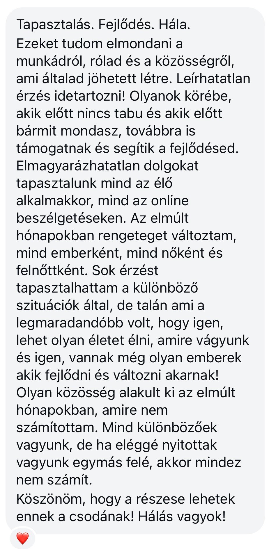 Talán eddig azért nem merted kimondani, mert ennél jóval kisebb dolgokért is a környezeted elítélt, megbélyegzett, esetleg elfordult tőled. A közösségben viszont gondoskodunk arról, hogy a nehéz szembenézéseket egy biztonságos közegben tudd megtenni.